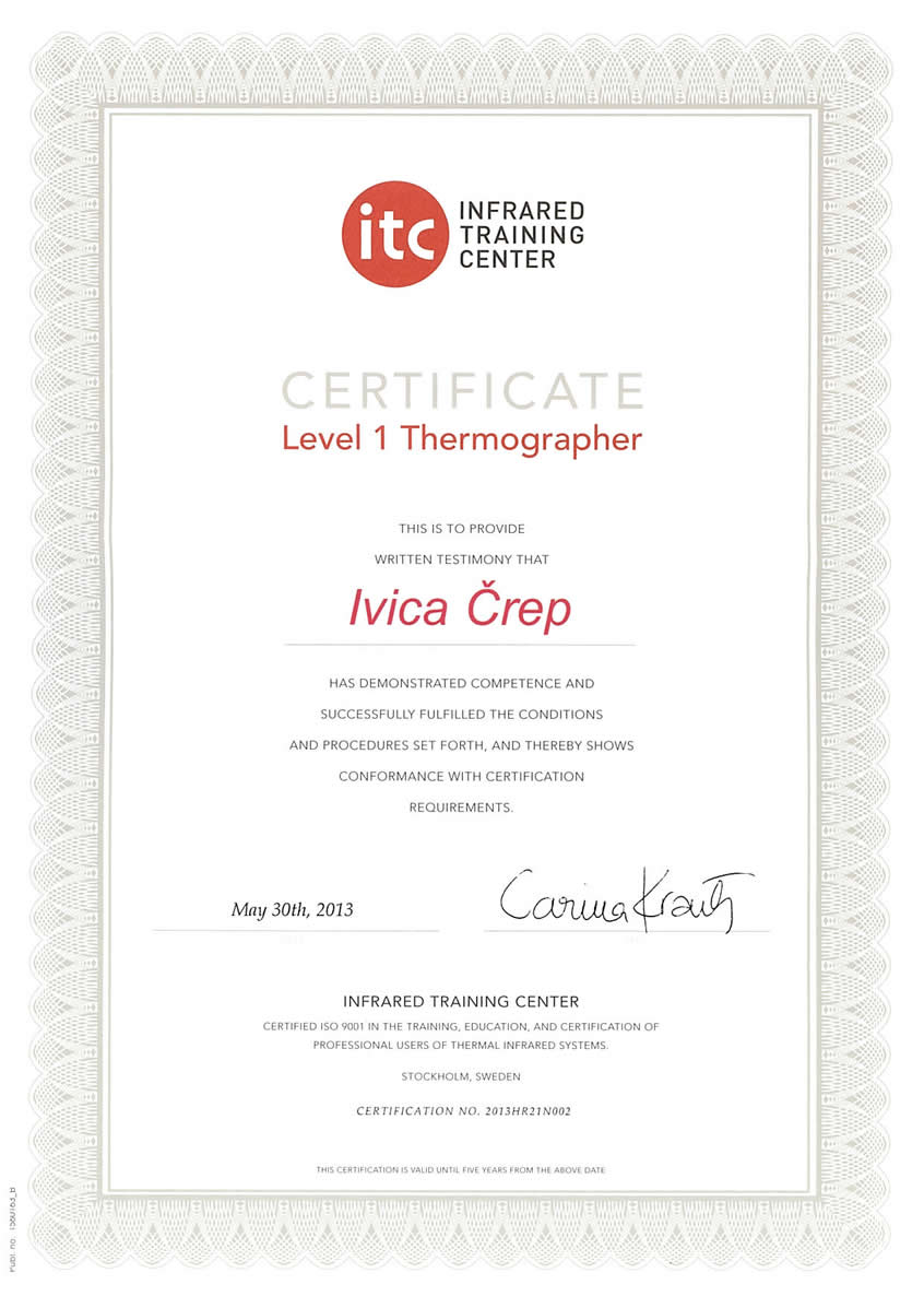 Tvrtka TermoScan posjeduje međunarodni certifikat za infracrvenu termografiju Level 1.